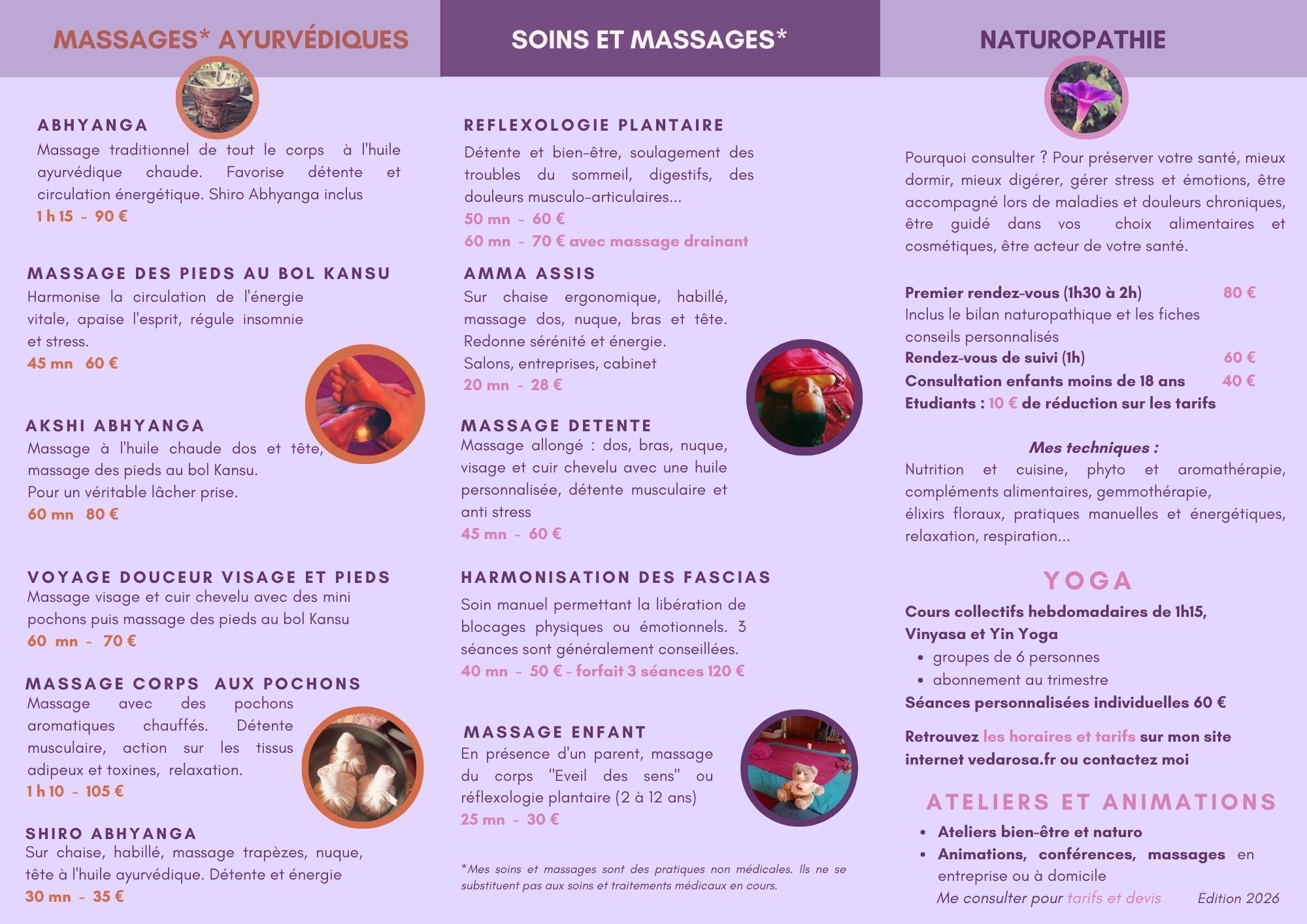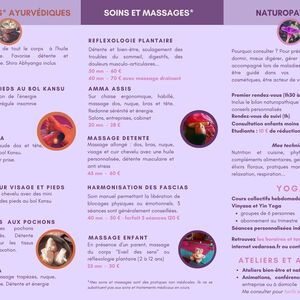 Je suis spécialisée en réflexologie plantaire et en massages Ayurveda (formation Yogsansara et Divali), je pratique des soins énergétique et d'harmonisation des fascias. J'enseigne également le Yoga, en petits groupes pour m'adapter aux besoins de chacun (formation Shivashakti)